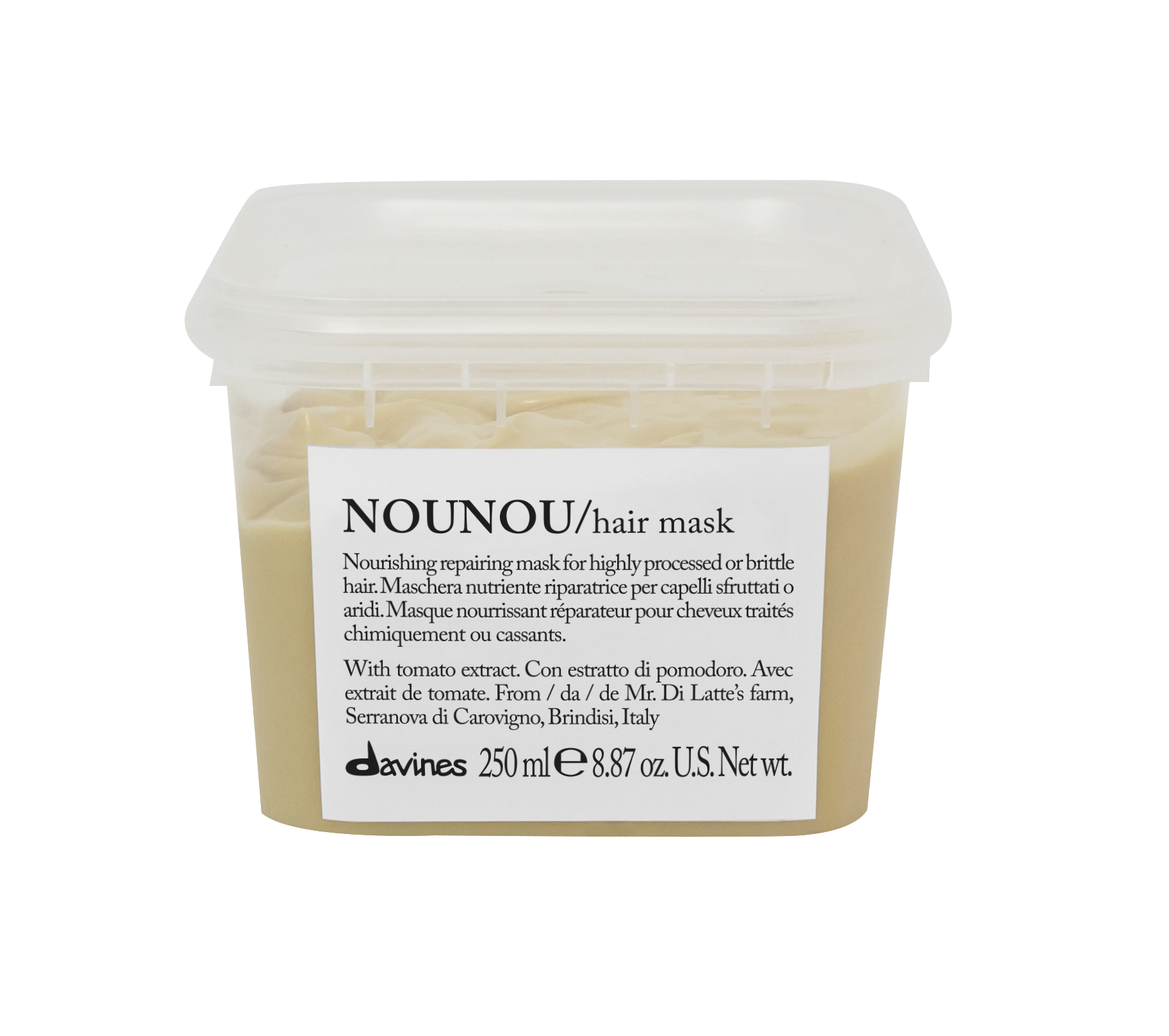 Nounou… No me dejes de usar. Soy la mascarilla perfecta para nutrir y reparar tu pelo maltratado por procesos químicos, tengo proteína procedente del tomate fiaschetto, dejo tu pelo suave y brillante. Úsame sin importar tu textura. ¿CÓMO ME APLICAS?: Lava con shampoo, retira el exceso de humedad y aplícame por secciones dejando 1cm de tu raíz, déjame por 10 o 15 minutos y enjuágame 100%.